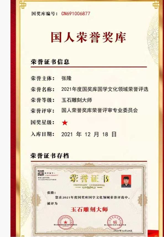 荣誉称号 国家高级雕刻师、亚洲珠宝联合会玉雕大师