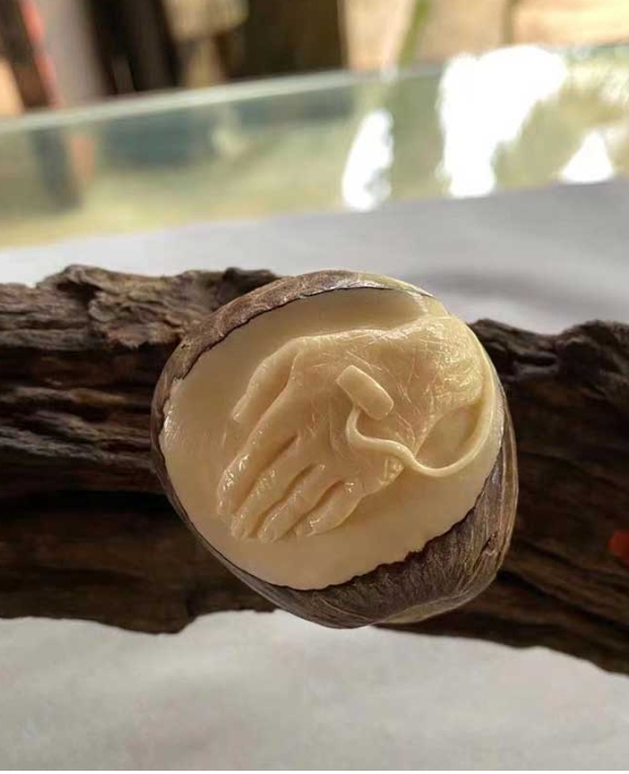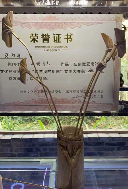 在创作过程中,张胜祥始终将创作灵感聚焦于云南独特的“植物王国”自然资源和丰富的民族文化资源,最终他将创作目光定格在缅茄菩提这一云南特有的树种种子,展开微雕创作,成为缅茄菩提微雕的创始人。在云娜,种子雕刻虽然有一定历史,但由于技法较为粗放、宣传挖掘不够,导致这项极具创意的民族手工技艺一直未被人们所熟知。张胜祥凭借自己深厚的木雕手工技艺和良好的美术天赋,将木雕技艺、艺术创意与云南民族手工和云南特有树种种子相结合,形成了独具一格又极富云南特色的手工技艺。不仅在民族技艺传承方面有重大推动作用,对树立云南文创品牌、打造云南旅游名片也同样具有重大意义。